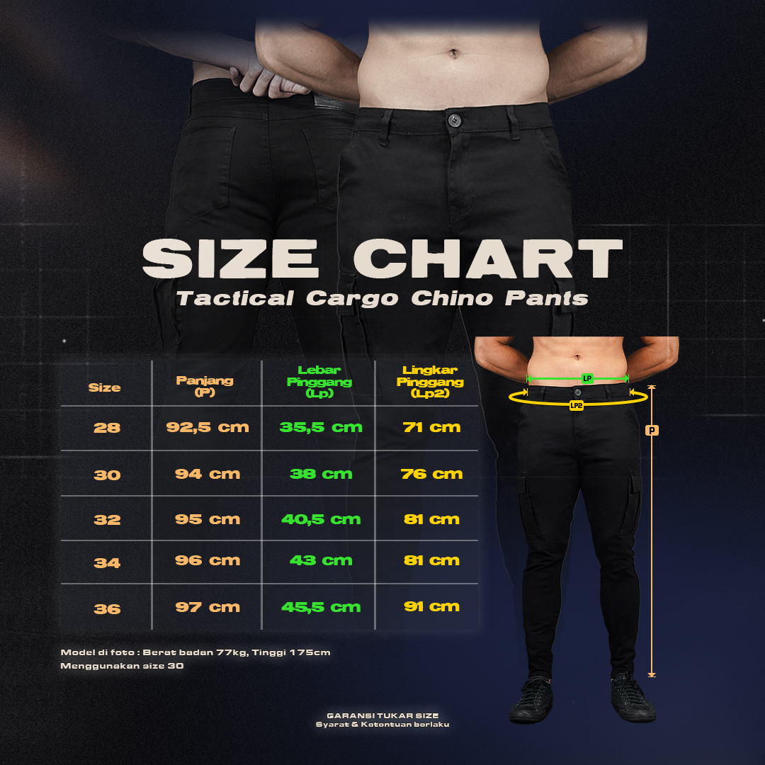 Tactical Cargo Chino Pants merupakan inovasi terbaru dari Neveres Casual. Chino ini tercipta dengan teknologi 4-way-stretch, super soft fabric, dan ketebalan sempurna yang memberikan tingkat kenyamanan tiada tara! Chino ini memiliki sizing skinny fit, namun fitting yang tidak menyiksa dan tetap nyaman di pakai. Celana ini juga di lengkapi dengan kantong cargo di bagian paha kiri dan kanan yang muat untuk banyak barang!