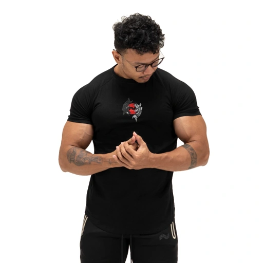 Desain gambar ikan koi hitam dan putih di tengah-tengah dada menambahkan sentuhan artistik pada kaos ini. Ikan koi melambangkan keseimbangan antara kekuatan dan kelembutan, menginspirasi Anda untuk mencapai keseimbangan dalam hidup dan aktivitas fisik Anda.